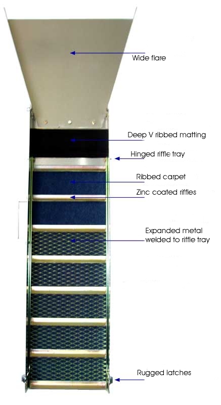 - Black rubber ribbed matting for instant gold recognition and improved fine gold recovery.
